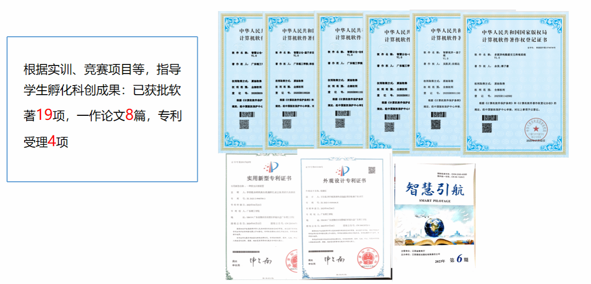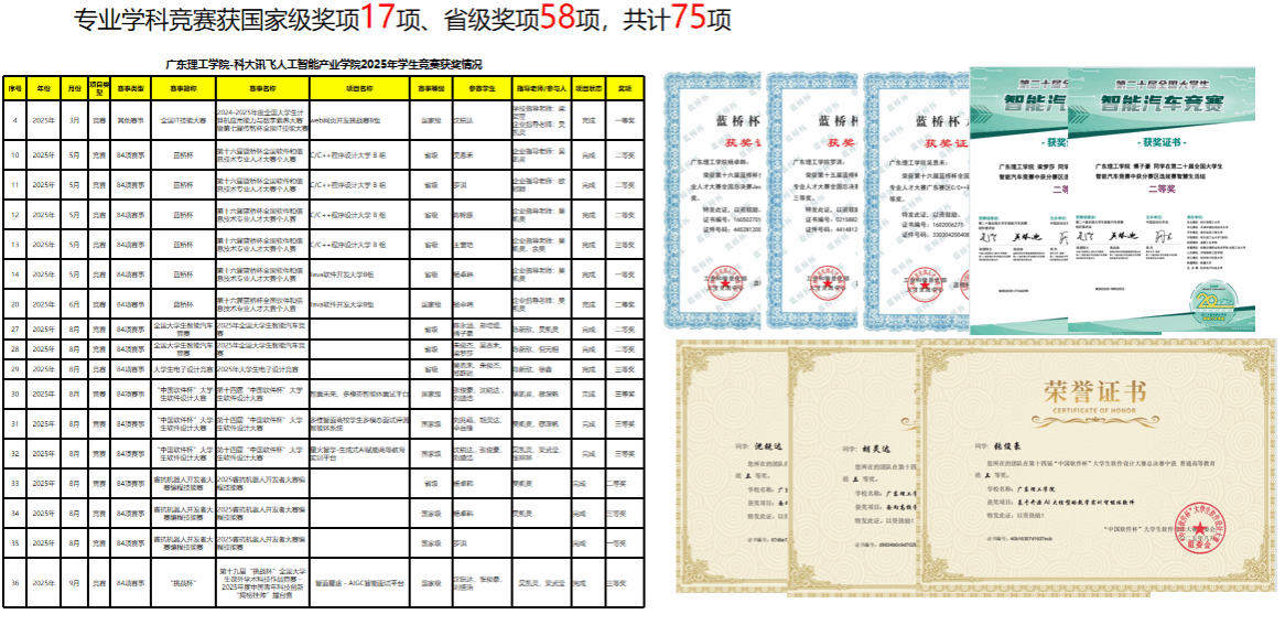 秉持“以赛促学、激发创新”理念,协同指导学生参赛,将竞赛内容融入专业课程与实践教学,构建“学-练-赛”一体化培养体系。合作以来,学生累计获国家级、省级学科竞赛奖项75个,发表软著、专利、论文31件。其中,一支队伍在第十九届“挑战杯”全国大学生课外学术科技作品竞赛2025年度“揭榜挂帅”人工智能主擂台赛中获国家三等奖,另一支队伍在第十九届全国大学生智能汽车竞赛全国总决赛讯飞创意组中获二等奖,成果斐然。
