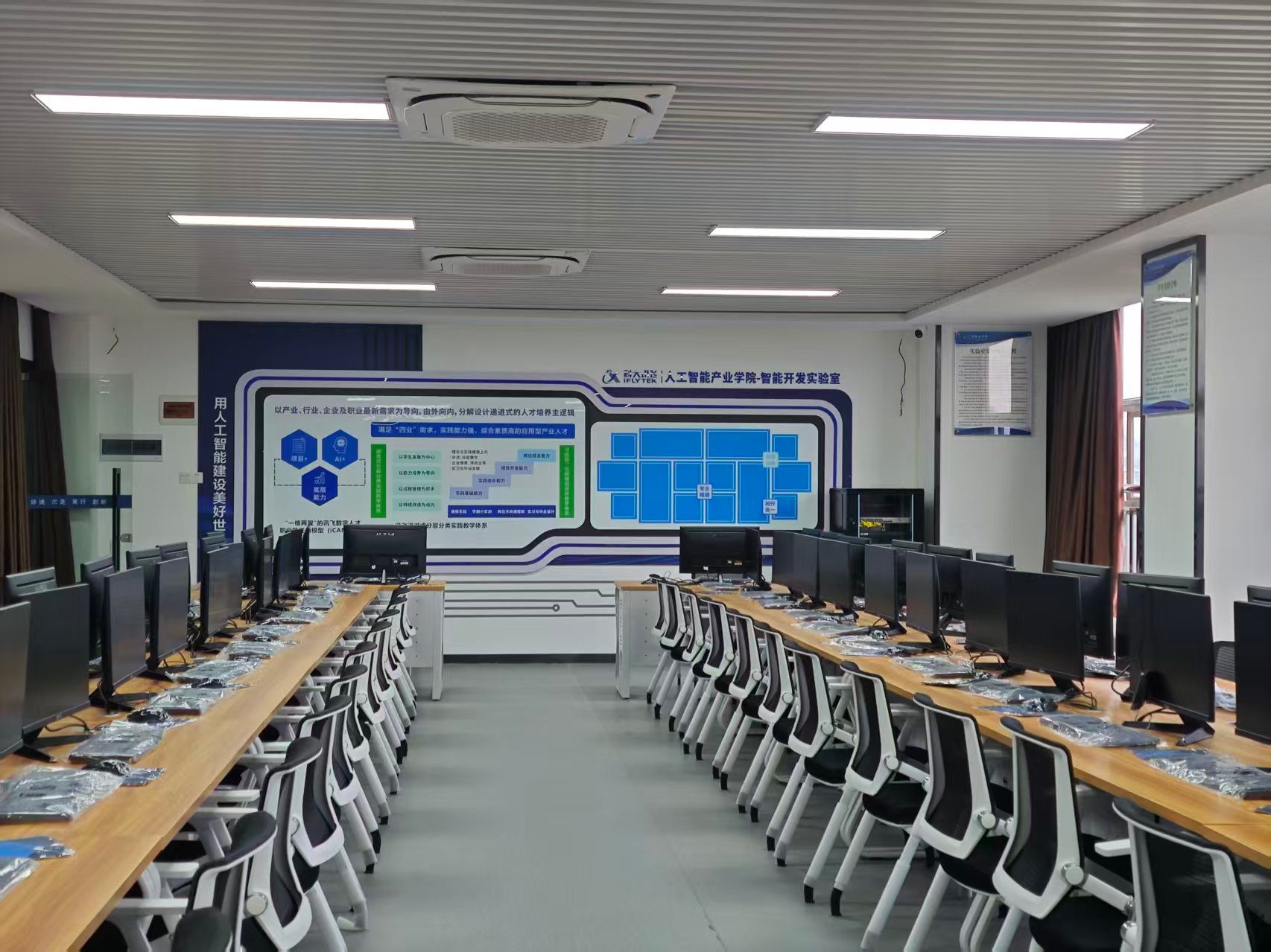 教学上,以“一核两翼”能力模型为核心,致力于推动产业链与人才链的深度融合。由科大讯飞股份有限公司5年及以上企业工程师指导授课,通过“课程实验→项目实训→企业实习”的递进式培养路径,引入“AI+行业”特色课程模块,校企协同培养兼具职业底层能力、项目实践能力与AI应用能力的复合型人才。