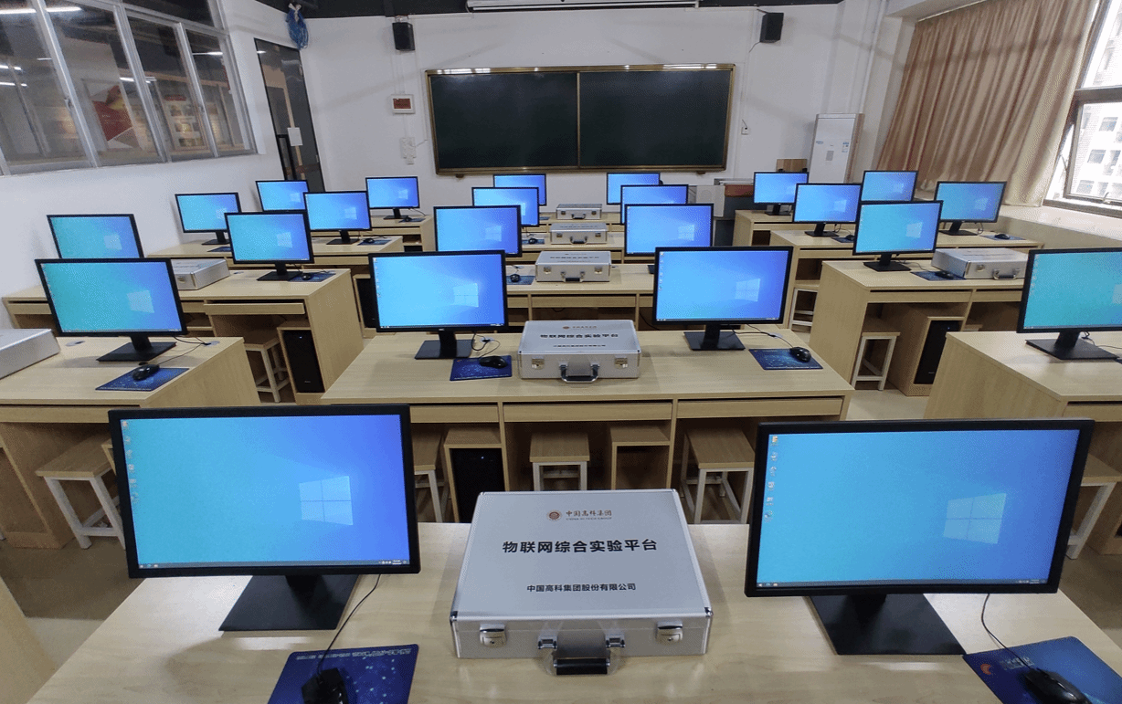 物联网实验室位于综合楼605,配置有18套高科定制物联网教学专用物联网实验箱,同时配备了35台物联网教学用配套电脑(Intel I5处理器,16G内存,256G固态硬盘+1T机械硬盘),可同时容纳52名学生上课,主要安排物联网实验课程如:《5G物联网及NB-IoT技术》、《5G物联网应用实训》等课程。
