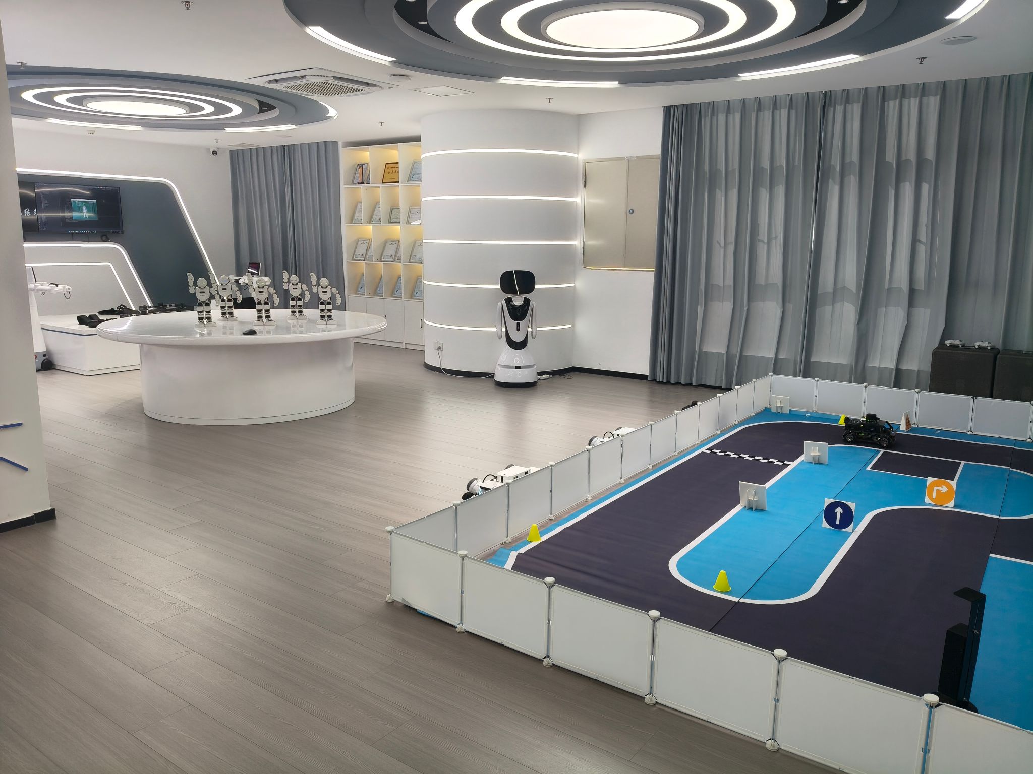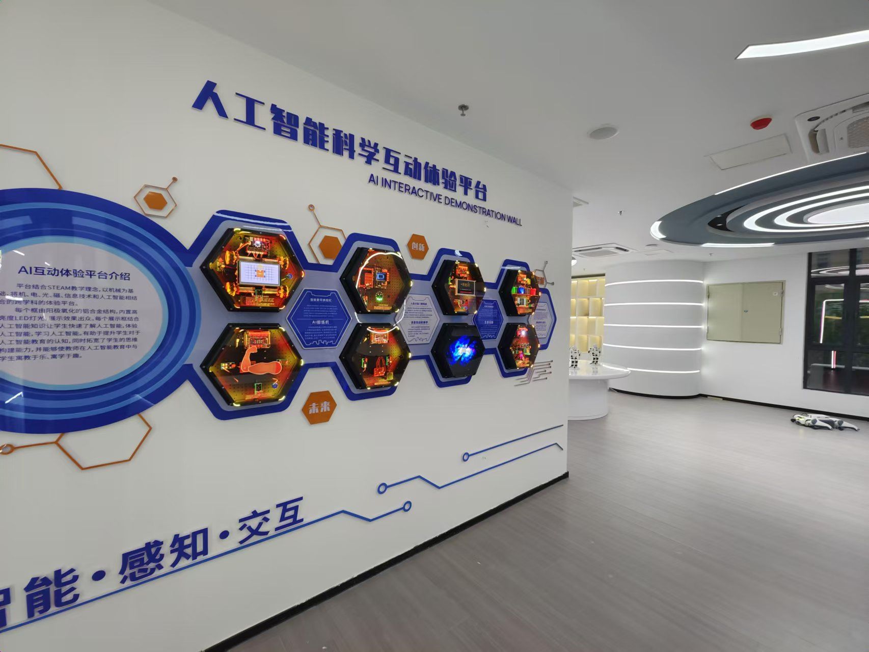 人工智能展厅位于求实楼303,是我校建设的人工智能前沿技术展示、科普教育和实践体验的重要平台,以人工智能技术为核心,全面展示了人工智能在不同领域的创新成果和实际应用。展厅主要有智能讲解机器人、智能人形机器人、智能四足机器狗、人工智能互动体验套件、轮式人形机器人、自动驾驶综合实训套件等设备,支撑我校相关专业的课程实践与师生的课题研究,同时也打造了沉浸式的AI互动体验环境,参观者可以亲身体验人工智能技术及其应用场景,激发其对人工智能技术的兴趣和探索精神。