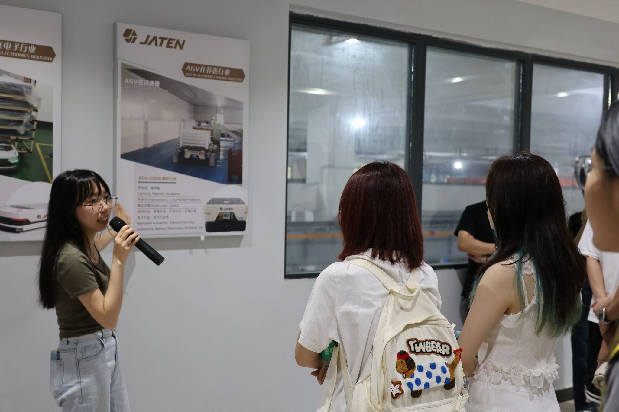 团队首站抵达广东嘉腾机器人自动化有限公司,该公司HR梁嘉敏不仅详尽介绍了公司的基本情况与发展历程,还带领信院学子参观生产车间与产品展厅。师生一行得以近距离观摩AGV机器人、RGV系统及智能柜等先进设备的制造工艺,并在产品展厅中全面了解了嘉腾机器人的技术创新成果及其在行业内的广泛应用案例。此外,HR经理唐智锌老师开展专题讲座,围绕“机器人+”时代就业方向进行深入探讨,对公司岗位设置进行了深度解读,同时针对求职技巧与简历撰写给予了实用建议。