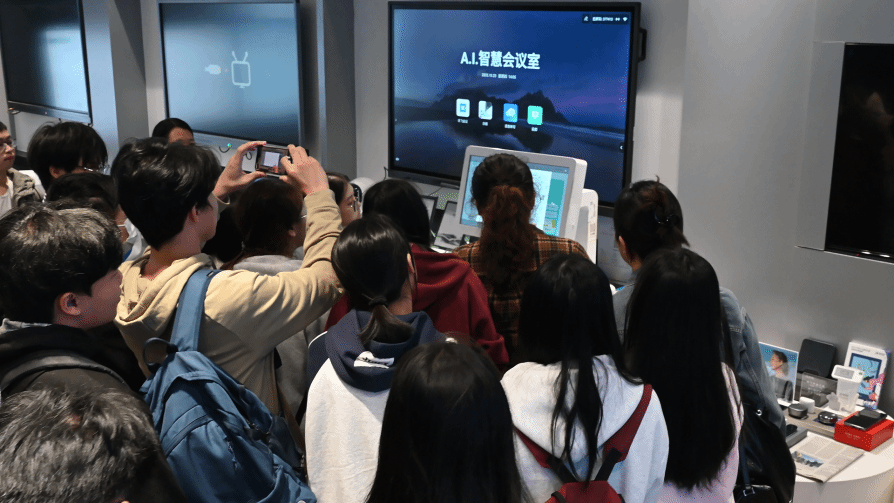 随后,张文娅老师带领我院学子参观企业展厅,学生在展厅体验人工智能多元应用,包括医疗领域的助听器和诊断助手,教育领域的自动批阅机和智能黑板,办公与就业领域的求职助手等工具,以及商务、传媒领域的评标和配音应用。