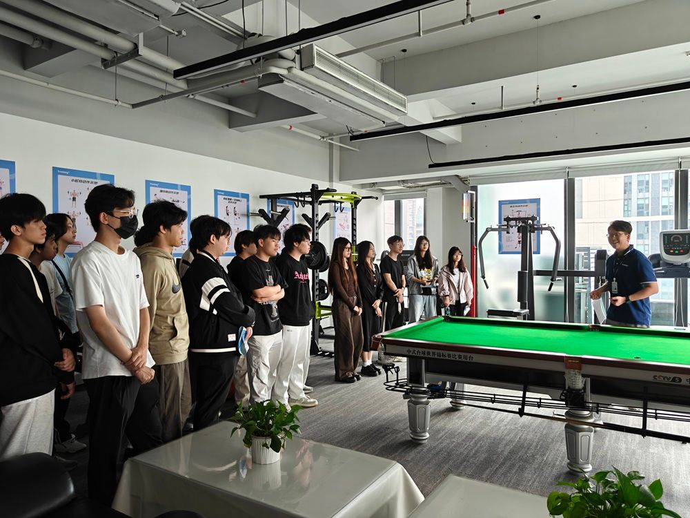 在公司负责人的带领下,师生们参观了公司的休闲区域。这里配备了健身房、台球桌等设施,既为员工提供了劳逸结合的放松空间,也展现了公司“以人为本” 的企业文化,让大家感受到企业不仅注重技术创新,更关注员工的身心健康与生活品质。