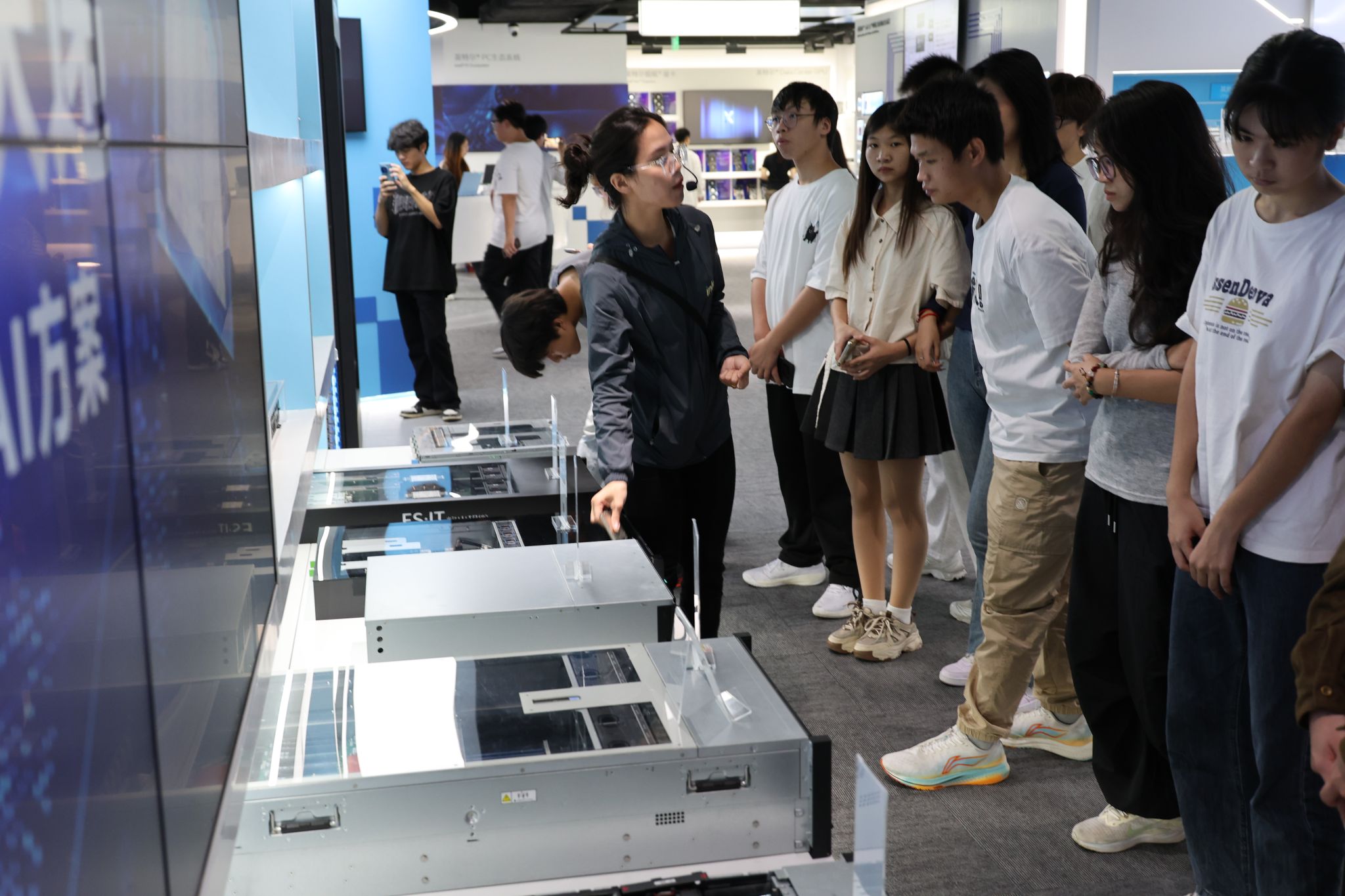 英特尔大湾区科技创新中心人才培训项目经理周琳菊、市场经理曾德清引导师生们前往展厅,展厅讲解员通过讲解、演示、视频的方式,让同学们对英特尔的发展历史,以及英特尔在芯片制造、人工智能、大数据、互联网等领域的最新突破和应用有了初步了解,也让大家更加深刻理解了科技力量无处不在。
