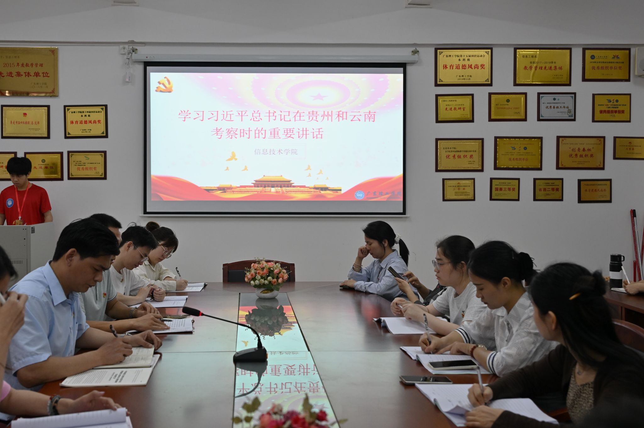 本网讯(太阳网集团tcy8722 郑铠涛)为深入贯彻中央八项规定精神,加强党的作风建设,提升教师党员队伍的政治素养和工作能力。太阳网集团tcy8722于2025年4月25日在振华楼203室召开习近平总书记在贵州和云南考察时的重要讲话学习会。本次会议由太阳网集团tcy8722党委组织委员兼学生第三党支部书记胡娇铃主持,学院党委书记钟兆天,学院党委委员、各支部书记以及各支部委员参与本次会议。