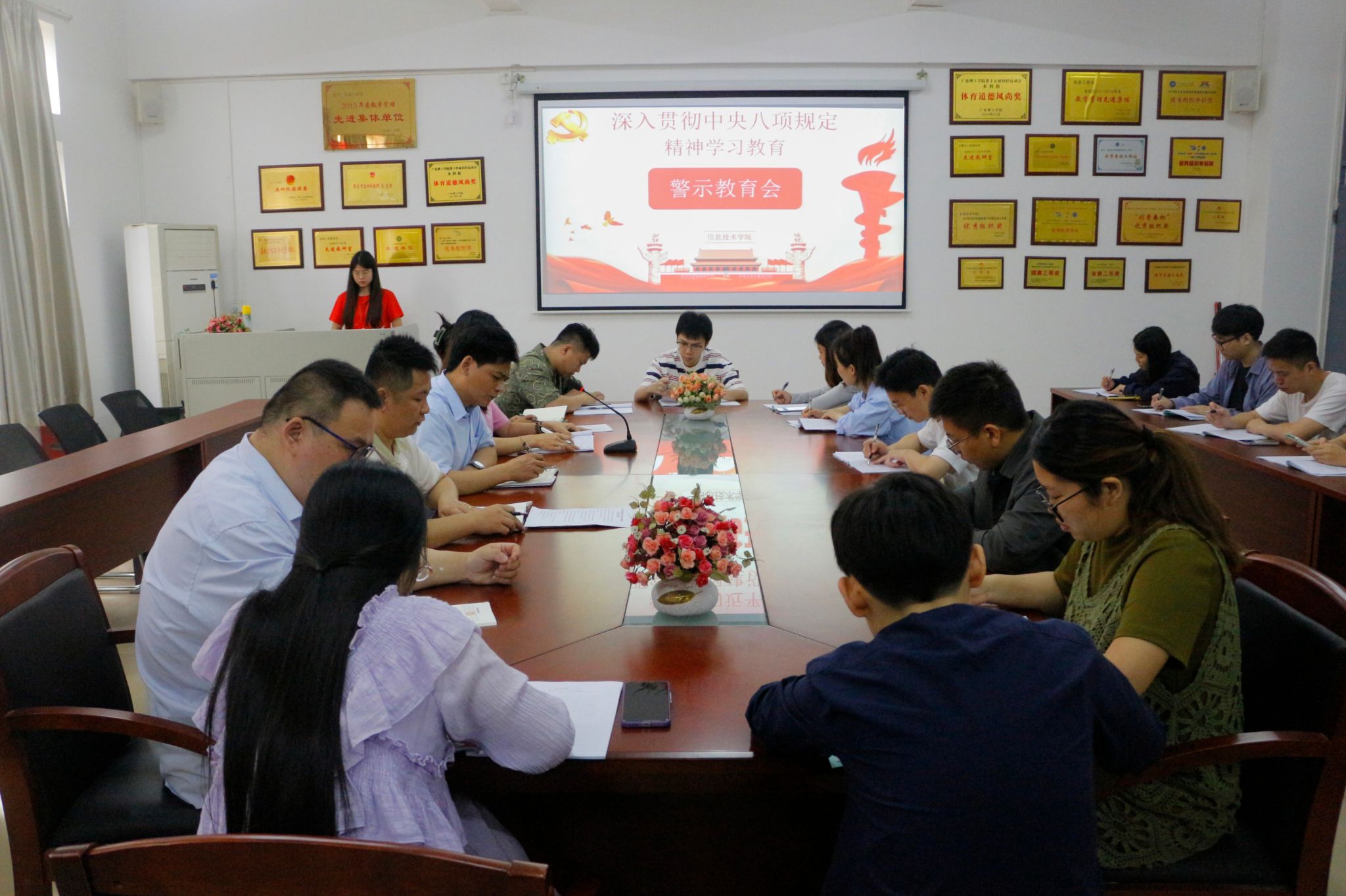 本网讯(太阳网集团tcy8722 彭沁怡)为进一步深入贯彻中央八项规定精神学习教育,引导党员干部受警醒、明底线、知敬畏,强化廉洁自律意识,太阳网集团tcy8722于2025年5月7日在振华楼203室召开深入贯彻中央八项规定精神学习教育警示教育会。本次会议由太阳网集团tcy8722党委组织委员兼学生第三党支部书记胡娇铃主持,学院党委委员、各支部书记及各支部委员参会。