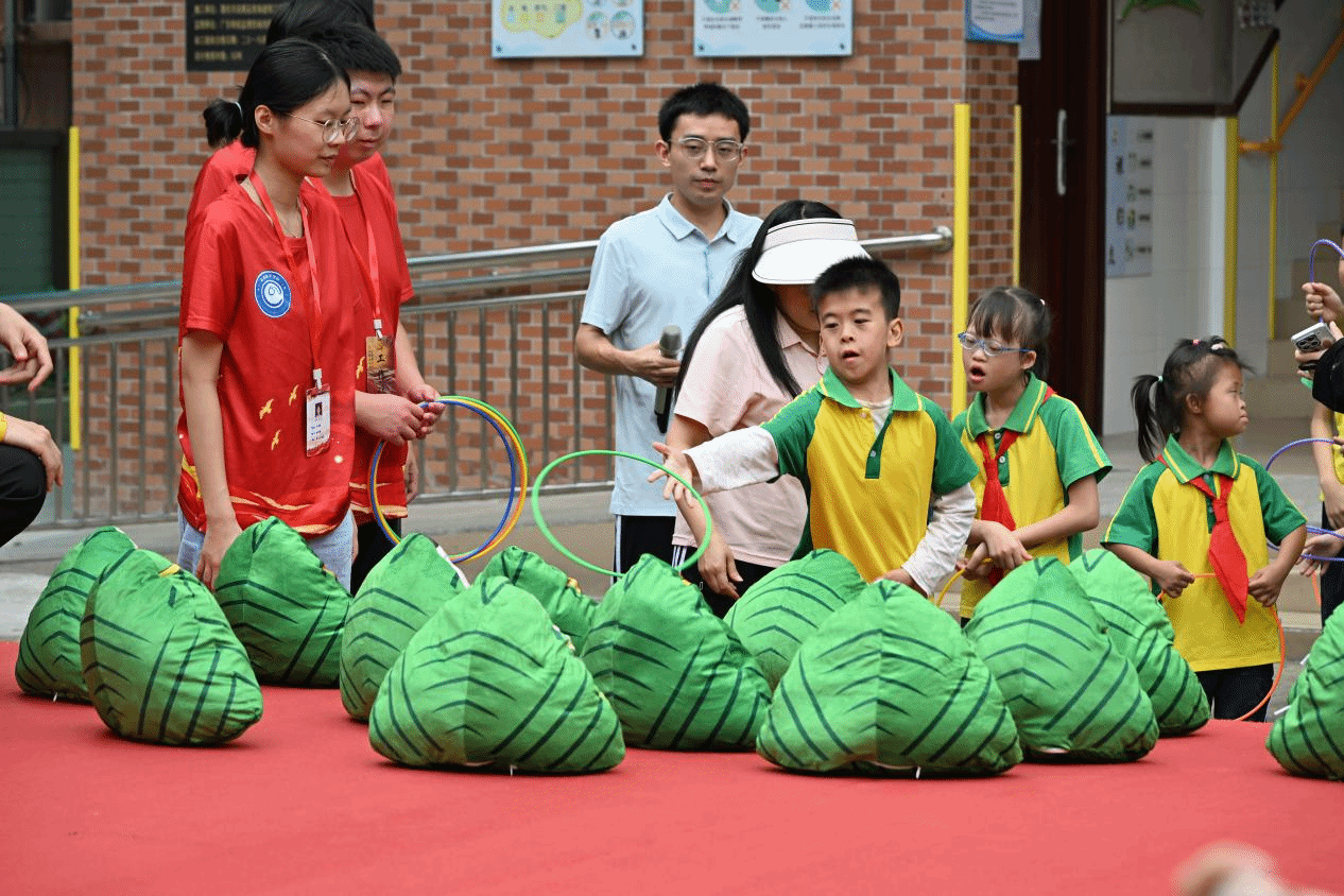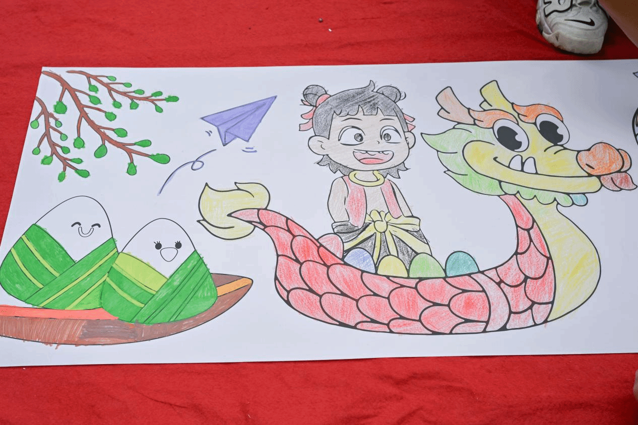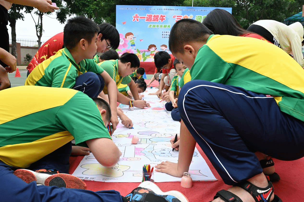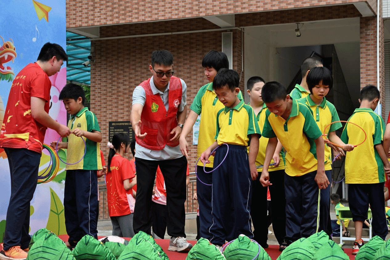 活动中,孩子们在志愿者的陪伴下,用彩笔绘制心中的端午节,让五彩斑斓的龙舟和粽子跃然纸上。随后,志愿者们手把手教孩子们缝制艾草香囊,在志愿者的耐心指导下,他们一针一线地缝制着香囊,不仅体会到传统手工艺的魅力,还在淡淡的艾香中感受到端午驱邪祈福的文化内涵。接着,志愿者们通过趣味游戏的形式,让孩子们用套圈赢取可爱的粽子玩偶,现场欢声笑语不断,气氛热烈。最后,在启智学校的组织下,志愿者们协助开展了创意的“旱地龙舟赛”。孩子们分组协助竞赛,在欢乐中收获友谊,体验到团队协作的乐趣。