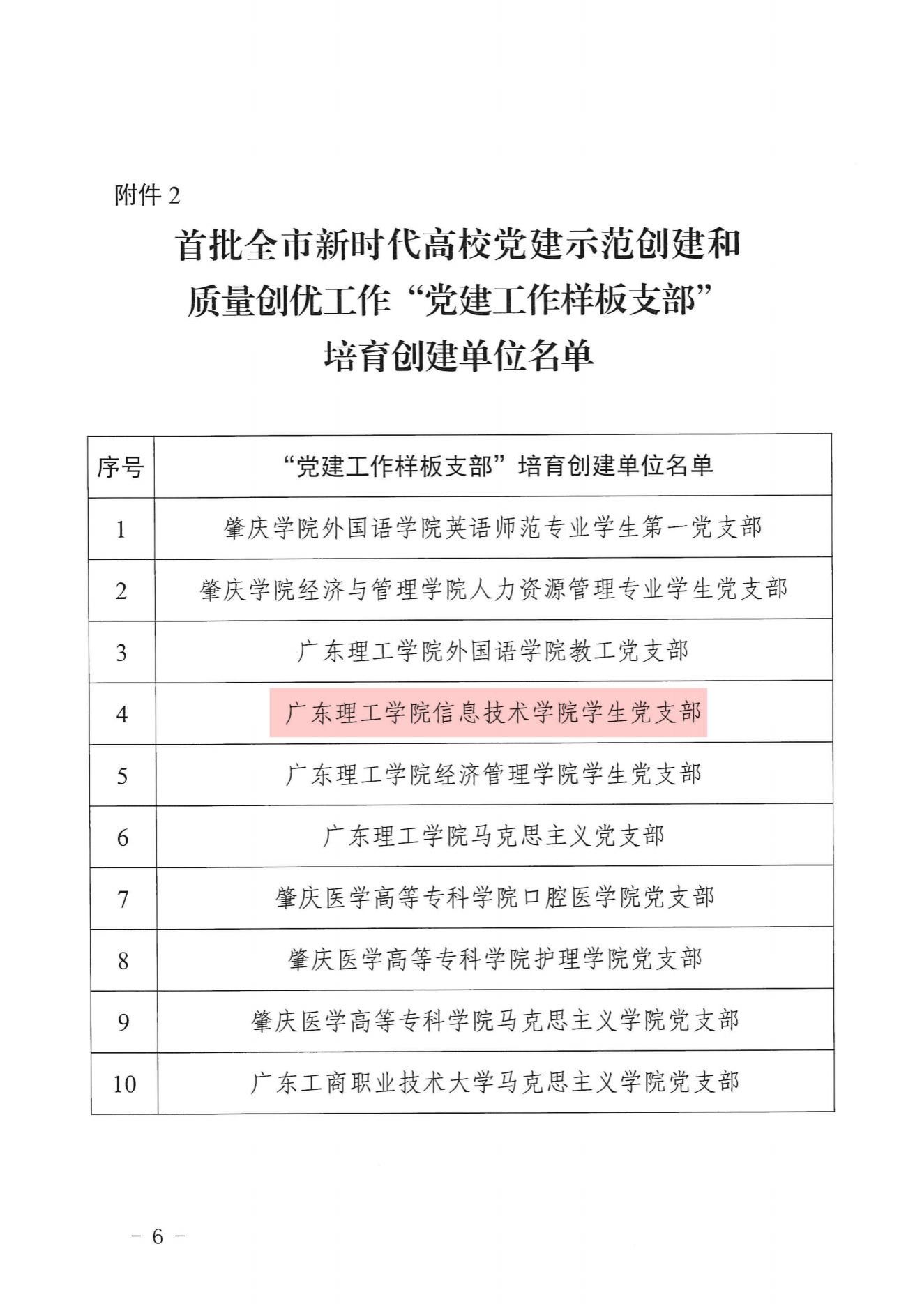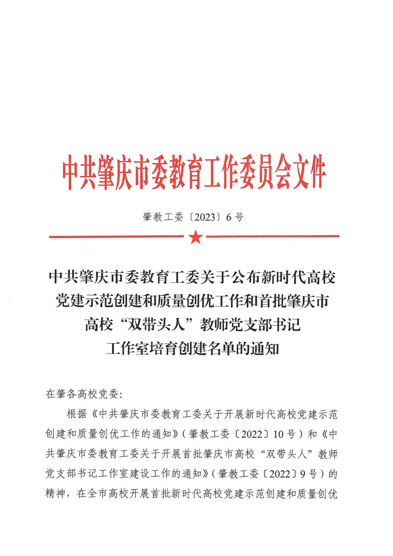 本网讯(太阳网集团tcy8722 李伟发)近日,中共肇庆市委教育工委公布了首批全市新时代高校党建示范创建和质量创优工作和高校“双带头人”教师党支部书记工作室培育创建名单。其中,太阳网集团tcy8722学生党支部入选为首批全市新时代高校党建示范创建和质量创优工作“党建工作样板支部”培育创建单位。