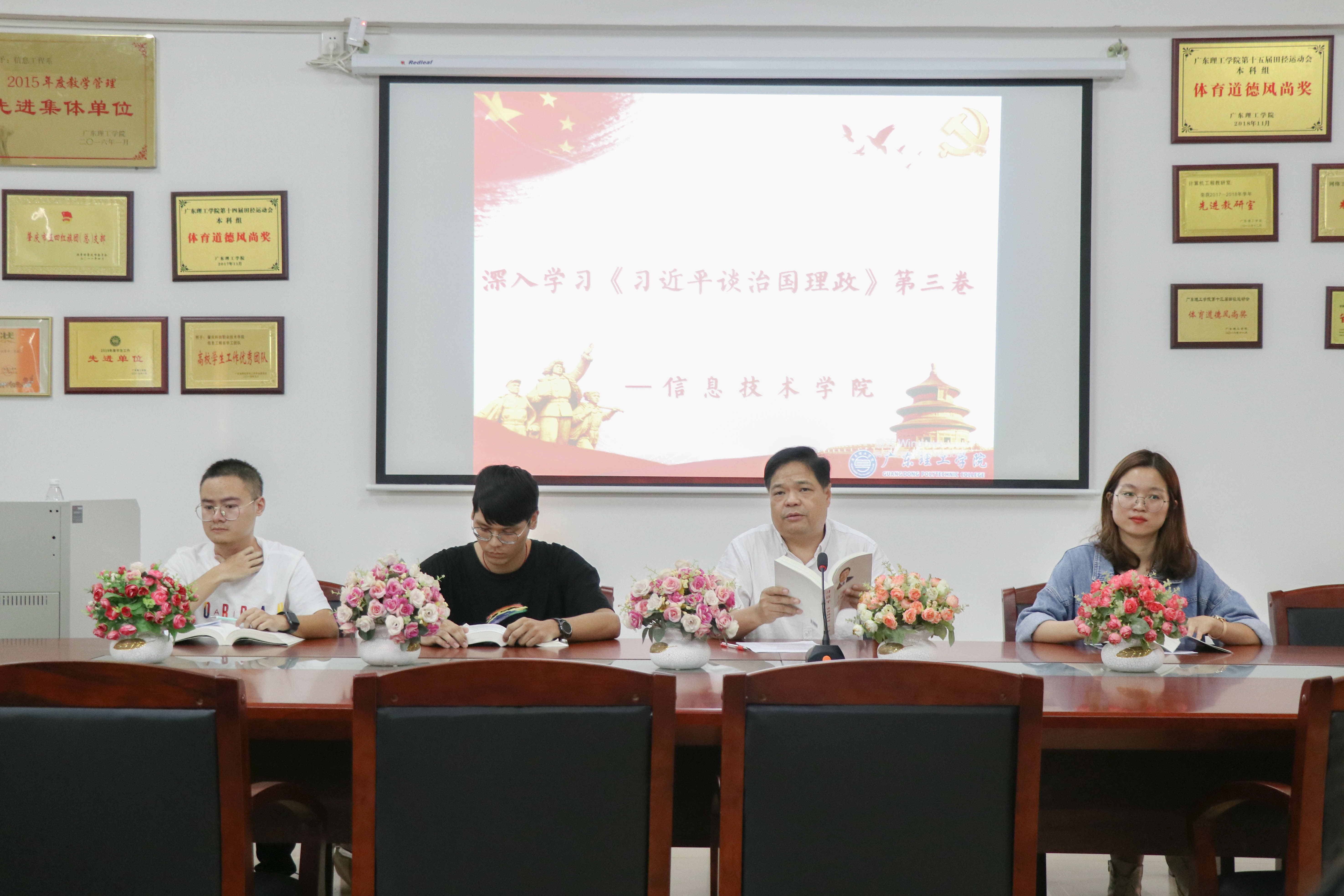 接着,胡娇铃老师带领参会人员研读了第三卷中的《广大干部特别是年轻干部要做到信念坚、政治强、本领高、作风硬》、《贯彻习近平总书记重要讲话和重要指示批示精神》及《习近平总书记出席深圳经济特区建立40周年庆祝大会重要讲话精神》,指出学生干部要舍得花精力,全面系统学,及时跟进学,深入思考学,联系实际学,将其中所蕴含的重要精神和指示运用到自己的学习生活实践中,提高运用党的创新理论指导应对重大挑战,加强思想觉悟。