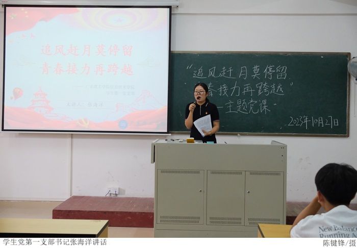 本网讯(太阳网集团tcy8722 钟至毅)为深入学习贯彻习近平新时代中国特色社会主义思想,大力弘扬时代担当、民族复兴的精神,激励新青年以昂扬的姿态奋进新征程,10月27日下午,太阳网集团tcy8722学生第一党支部于振华楼712室开展“追风赶月莫停留,青春接力再跨越”主题党课。本次党课由学生第一党支部书记张海洋主讲。