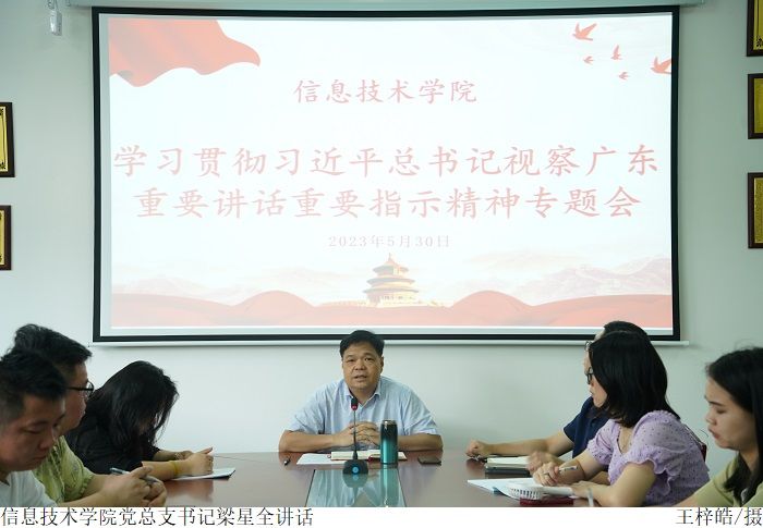 会上,党总支副书记冷云峰带领全体参会人员学习习近平总书记视察广东重要讲话内容,表示要把思想和行动统一到习近平总书记视察广东重要讲话、重要指示精神上来,切实增强学习贯彻的思想自觉、政治自觉、行动自觉,进一步把所学所思转化为做好本职工作的强大动力,守正创新、苦干实干,以新担当新作为奋力推进学校创新发展。