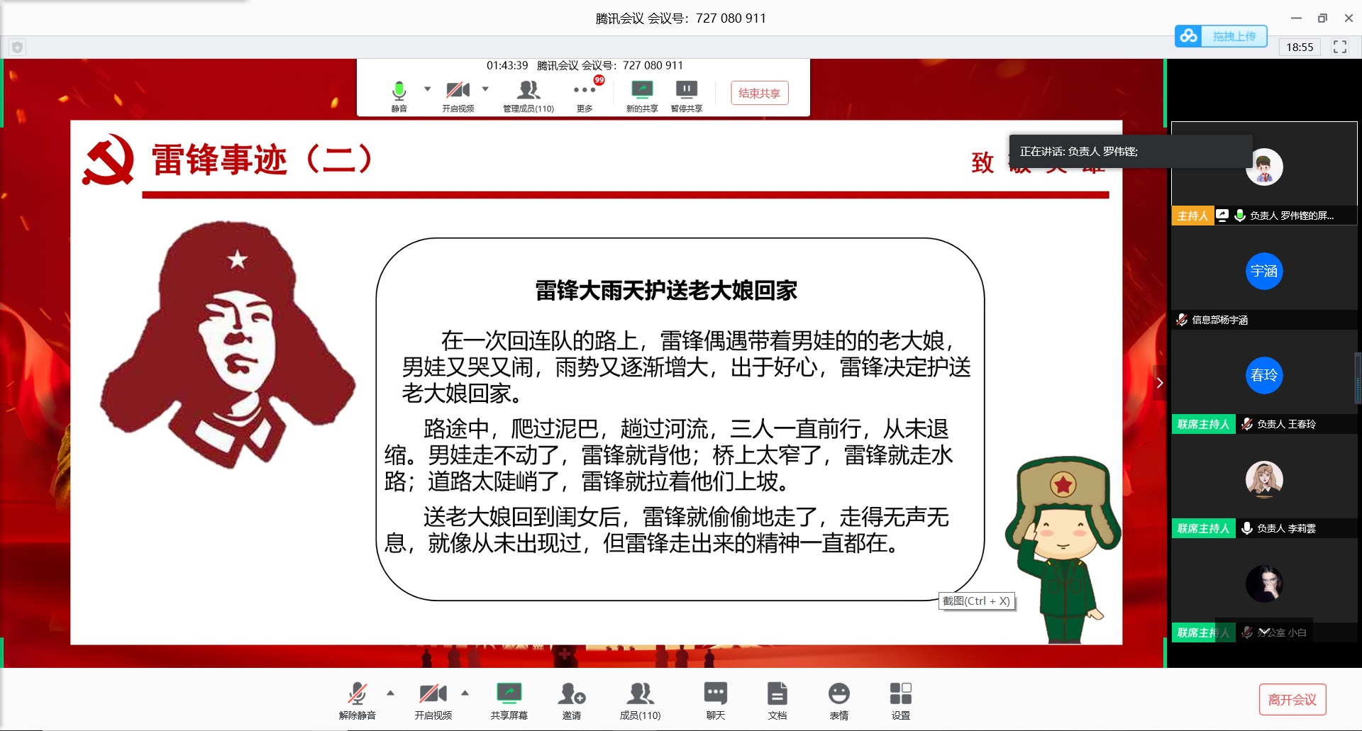 会议开始前,由分团委主席方木青致辞,他主要讲述了举行本次活动的重要性。紧接着进入本次会议,本次会议由雷锋的故事、中场活动——词语风暴以及在疫情中的雷锋精神三个部分组成,同时通过语言的描述、文字的叙述、视频的播放以及问题的抢答来串起整个活动。此次活动中,在负责人的引领下,参与成员们都积极的、热情的投入到会议当中。除此之外,太阳网集团tcy8722分团委还通过发表推文的形式来进行新时代雷锋精神的推广和宣传。