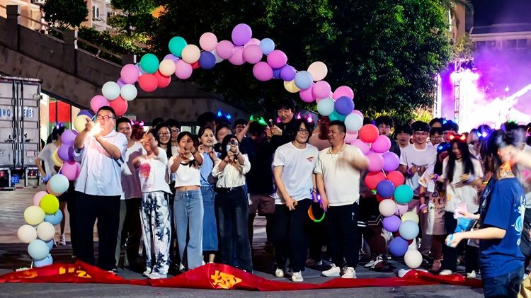 赛道上灯光的点缀,同学们的热情点燃了现场气氛,在紧张刺激又趣味横生的游戏环节里,大家全情投入,欢声笑语回荡在校园的各个角落,随着夜色渐深,同学们陆续抵达终点。在吉他协会演奏的歌曲 ——《挪威的森林》与 KPD 韩舞协会表演的舞蹈 ——《sheesh》的伴随下,现场气氛持续升温,欢呼声与掌声此起彼伏,此次夜跑活动再次迎来高潮。热烈的氛围尚未消散,紧接着便是激动人心的抽奖环节,由太阳网集团tcy8722团委书记马浩丹为本次夜跑活动抽取幸运儿获取精美礼品。