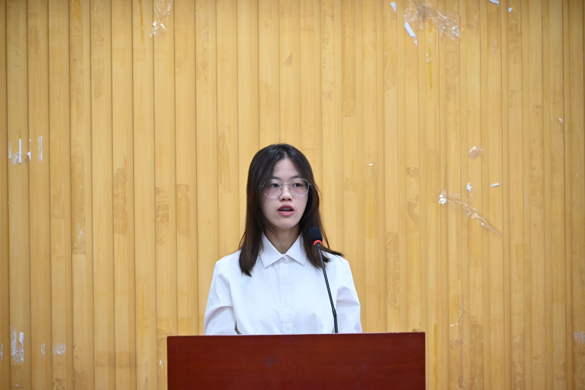 2022级本科网络工程2班的陆翠荣同学作为在校生代表发言。她首先表达了对2025届学长学姐们的敬意和祝福,并承诺将以师兄师姐们为榜样,在专业学习中深耕细作,在实践探索中锤炼本领,努力成长为一名为学院争光,为梦想拼搏的新时代青年!