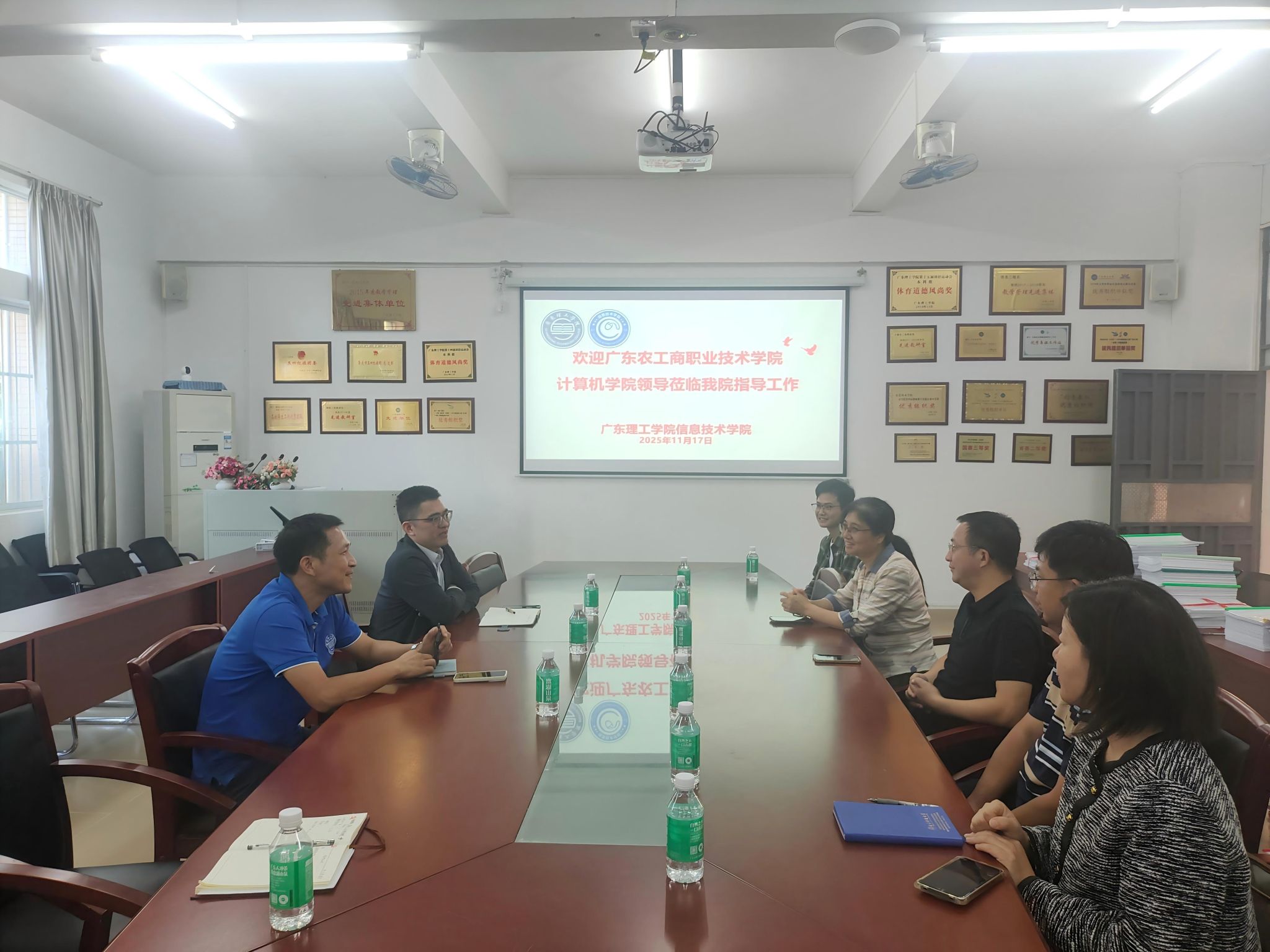 2025年11月17日上午10:00,广东农工商职业技术学院计算机学院领导一行莅临我院振华楼42203会议室,开展了一场富有成效的人工智能教育与专业建设专题交流。此次交流围绕课程体系建设、实验室资源配置、学生就业导向等核心议题展开深入探讨,为双方未来的深度合作奠定了坚实基础。