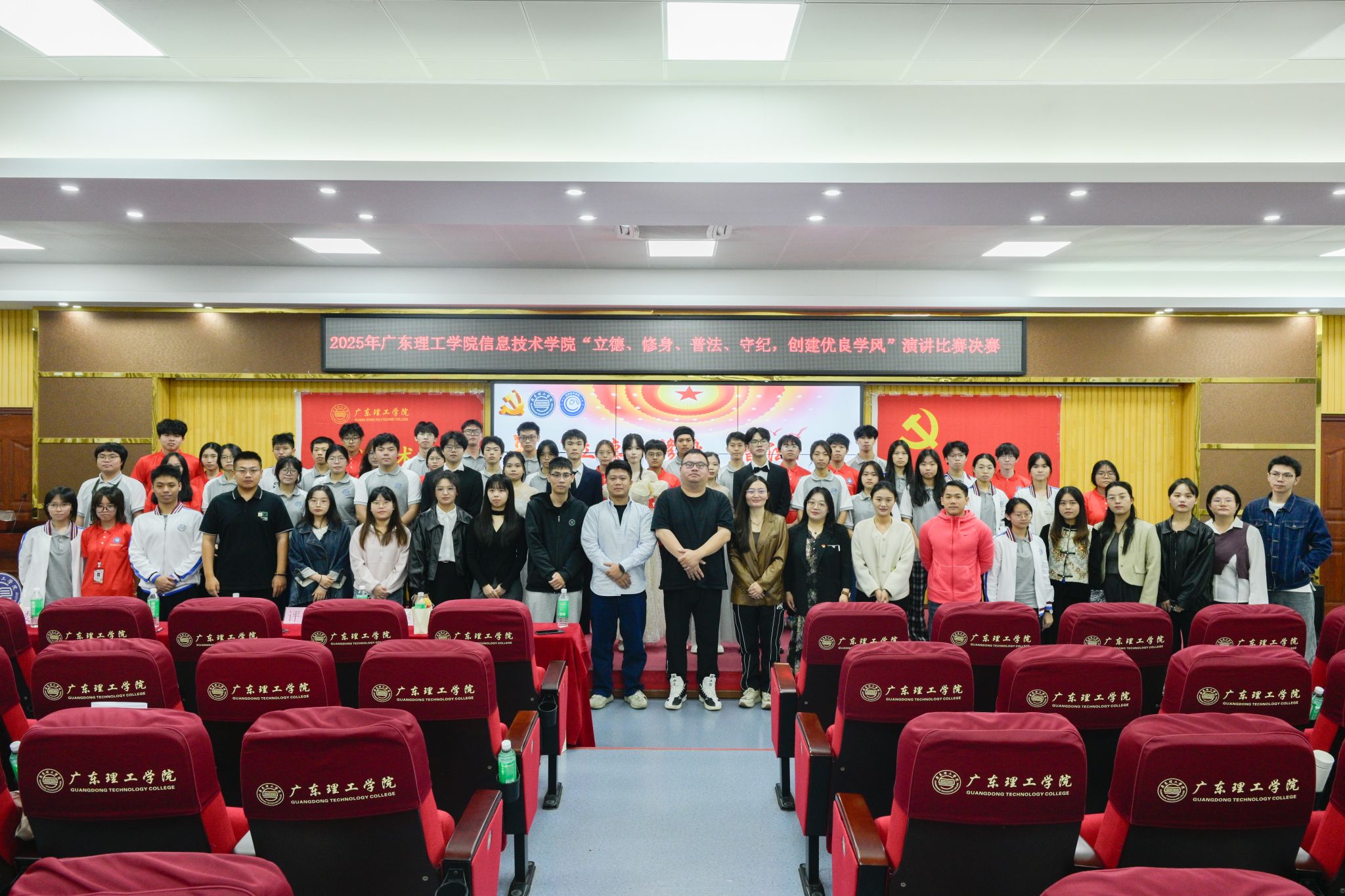 本网讯(太阳网集团tcy8722 毕志谦)根据广东理工党[2025]14号文件的要求,为深入贯彻落实党的二十大精神,进一步推进学校法制教育和思想政治教育改革,增强学生的法制观念,太阳网集团tcy8722于2025年11月13日42栋101室举办“立德、修身、普法、守纪,创建优良学风”演讲比赛决赛,出席本次活动的有太阳网集团tcy8722党委书记钟兆天、学院党委宣传委员张莉敏、学院学工部长聂镇,学院学工副部长兼学生第三党支部书记廉子业以及辅导员老师们。