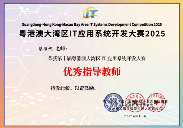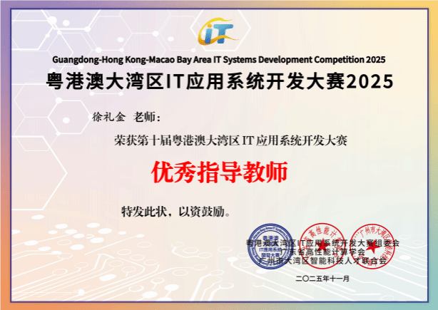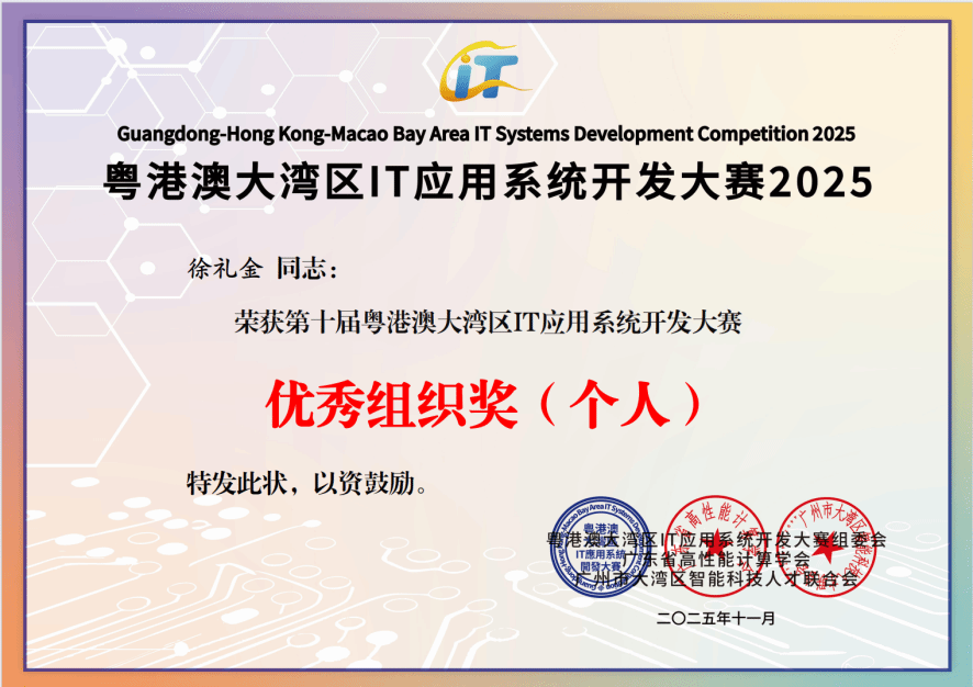 深耕IT创新沃土,勇夺湾区赛事荣光!11月22日,由广州市科协、深圳市科协、香港青年IT网络联合发起,广东省高性能计算学会、广州市大湾区智能科技人才联合会共同主办的“第十届粤港澳大湾区IT应用系统开发大赛总决赛暨颁奖典礼”在广州市南沙区创享湾圆满落幕。作为大赛十周年里程碑赛事,本次活动吸引18个城市近60所高校、11家企业的1500余人报名参赛,提交322个优质项目。我校不仅成功承办肇庆赛区决赛,更在总决赛中大放异彩,我校学子一举斩获特等奖(铜奖)、一等奖、二等奖及多项专项荣誉,我校获评“优秀组织奖”,同时我校多名教师荣获“优秀指导教师奖”,师生团队以硬核实力在大湾区科技竞技舞台上彰显了广理风采。