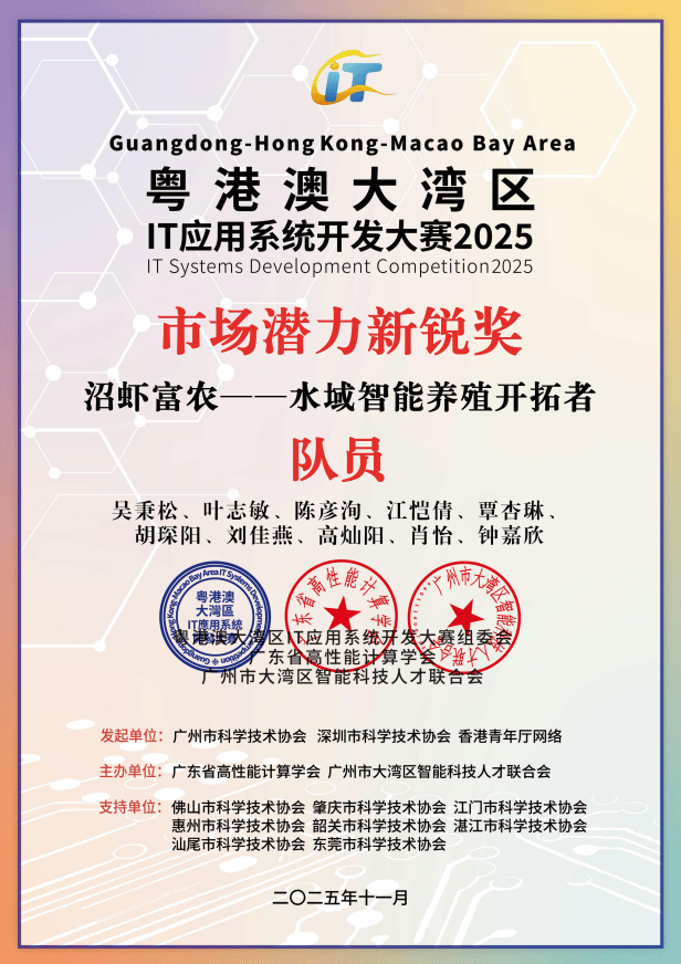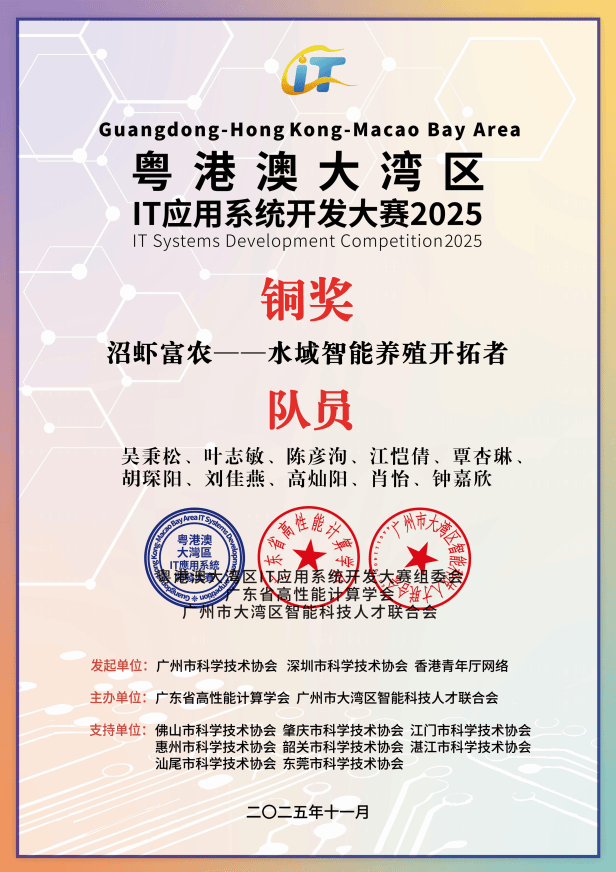 经过肇庆赛区的激烈角逐,我校“沼虾富农”队、“智视未来”队与“科创AI”队凭借突出表现脱颖而出,成功晋级总决赛。备赛期间,学校组建专项指导团队,林显宁、徐礼金、刘建友、倪元相、陈新欣和张莉敏等指导老师全程跟进,从项目创意打磨、技术难点攻克到演示方案优化给予全方位指导。学子们紧扣大湾区产业需求,将课堂所学与实际应用深度结合,反复迭代优化作品,为总决赛的角逐奠定了坚实基础。