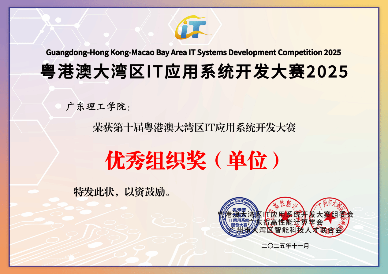 此次赛事的优异成绩,是对全校师生创新精神与实践能力的充分肯定。从肇庆赛区的成功承办到总决赛的多点开花,既展现了我校在IT领域的教学实力与育人成效,也彰显了广理学子敢闯敢试、勇攀高峰的青春风采。