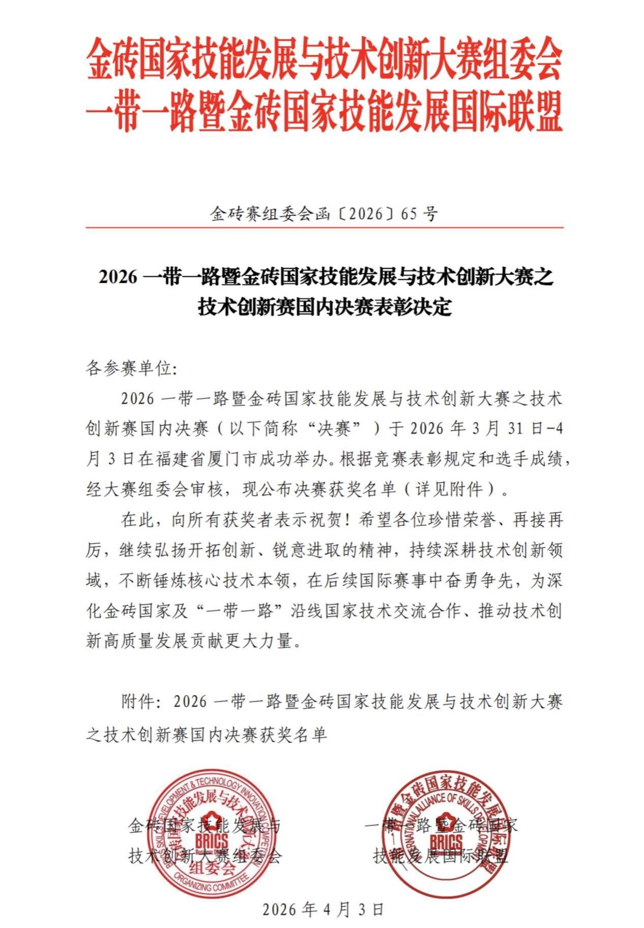 2026年4月1日至3日,2026“一带一路”暨金砖国家技能发展与技术创新大赛之技术创新赛国内决赛在福建厦门隆重举行。本次赛事由金砖国家工商理事会中方理事会、“一带一路”暨金砖国家技能发展国际联盟、“一带一路”暨金砖国家技能发展与技术创新培训中心共同主办。