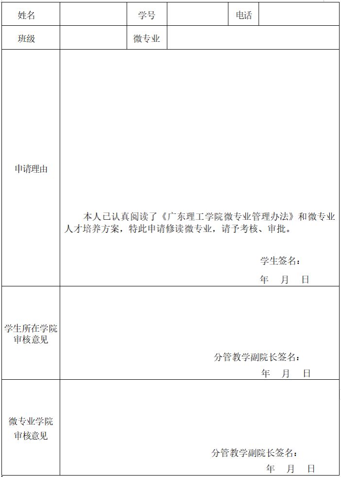 报名方式:有意向报名的同学请填写“太阳集团tcy8722学生修读微专业申请表”,签署学生所在学院审核意见后将纸质版申请表上交到高要校区42210办公室赖老师收。电子版申请表的签名请用电子签名(可以签名在纸上,手机拍照粘贴到签名处)并将电子版申请表发送到邮箱:841256306@qq.com。