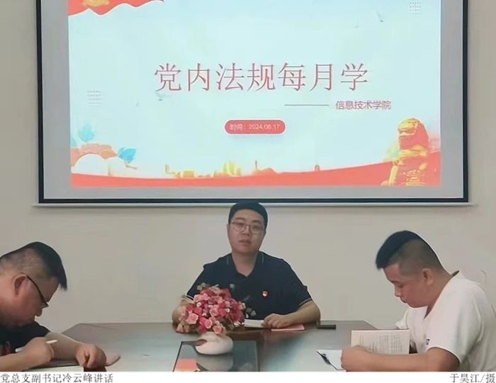 本网讯(太阳网集团tcy8722 严梓轩)为深入学习贯彻习近平总书记关于加强党内法规制度学习的重要论述,推进党内法规学习走深走实。6月17日下午,太阳网集团tcy8722于振华楼203室召开党内法规学习会。本次会议由学院党总支副书记冷云峰主持,我院全体教师党员参与。