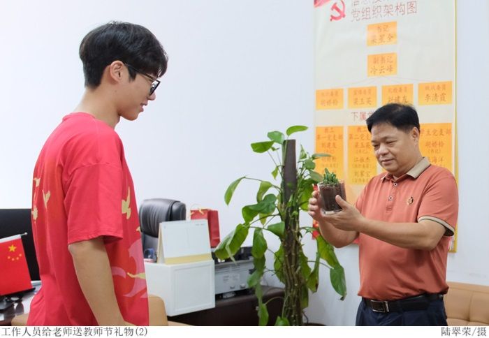 同学们为我院教师们献上盆栽礼物以表示最真切的祝福与感恩,感谢各位教师为学生成长所付出的辛勤与汗水,同时向教师们的崇高师德与奉献精神致敬。
