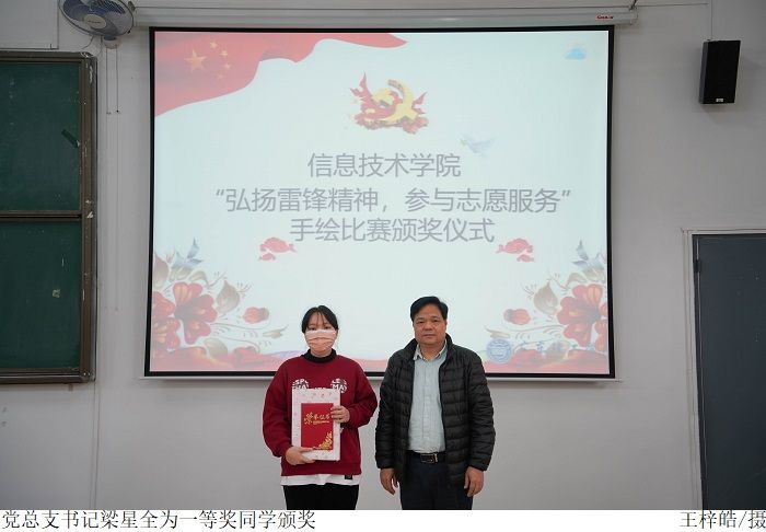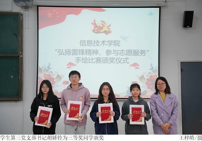 颁奖仪式上,主持人依次邀请各获奖选手上台领奖。由党总支书记梁星全为一等奖获得者颁奖,党总支副书记冷云峰为二等奖获得者颁奖,学生第三党支部书记胡娇铃为三等奖获得者颁奖,并合影留念。