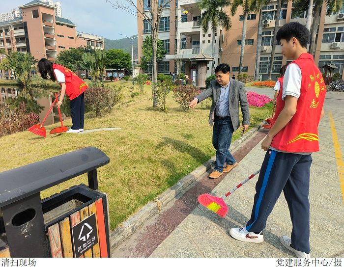 学院根据不同时间段分配志愿者开展清扫。志愿者们在振华楼2楼集合并领取清洁工具,有序前往指定地点对地面烟头、塑料垃圾、草坪树叶、卫生死角等进行了全覆盖清理,在大家共同努力下,学校环境得到了进一步改善。党总支书记梁星全对志愿者不怕苦、不怕累的精神表示肯定,并强调公区打扫是一项持续的任务,要以维护校园环境为己任,把创文工作当作常态化。