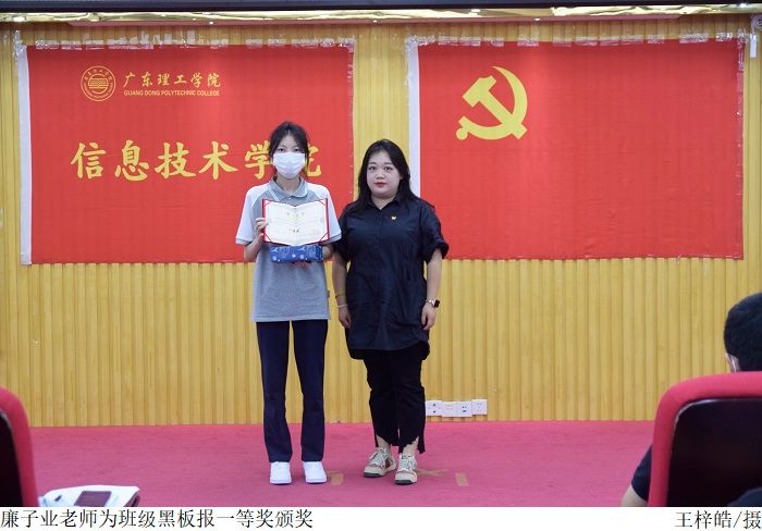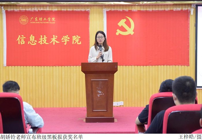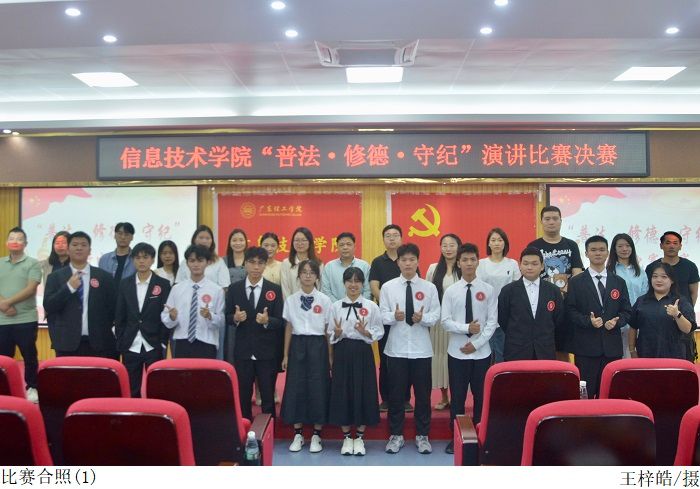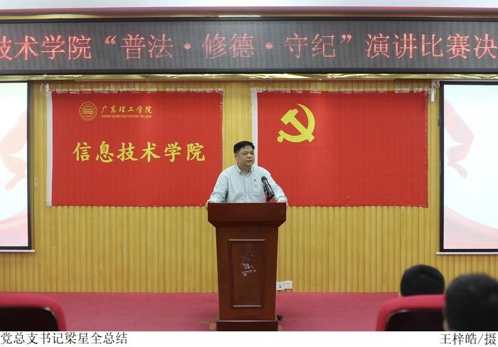 活动伊始,主持人宣布比赛正式开始并宣讲比赛规则。全体人员起立面向国旗,奏唱国歌。参赛选手依次上场进行演讲,以第一人称讲故事、举例子等多种方式展开演讲,演讲契合主题,内容创新多样而又紧贴生活时事。现场观众认真聆听,评委根据比赛规则中的评分标准为每位参赛选手的表现打出分数。比赛过程中,为活跃气氛还穿插了互动提问环节。随后由学生党支部书记胡娇铃老师宣布班级黑板报获奖名单并颁发奖状。工作人员在综合诸位评委的分数后,老师为获奖选手颁奖并合照留念。最后,梁星全对此次决赛进行总结,他希望当代青年能学以致用,将遵纪、守法、修德的观念铭记于心,内化于行,争做新时代的奋斗先锋。