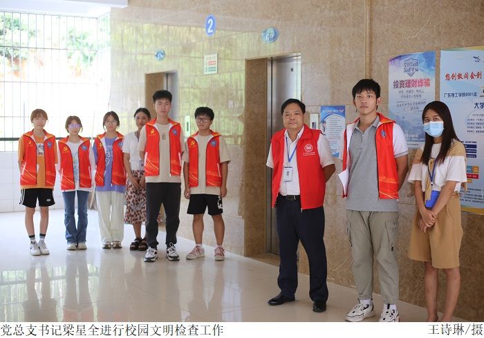在党总支书记梁星全的带领下,志愿者们分别在42栋楼梯口以及16、21、45、46、47和48栋宿舍楼门口进行校园文明检查工作,禁止学生带早餐及零食进入课堂,提醒仪容仪表不规范的学生返回宿舍进行调整,并检查宿舍及周边公共区域卫生。