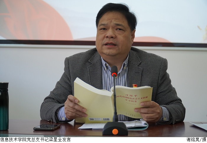会上,学院党总支书记梁星全首先领学第一议题,学习《习近平新时代中国特色社会主义思想学习问答》中的第17问:“我们党作为百年大党为什么必须始终牢记初心和使命”,梁星全要求全体党员应以坚定的历史自信和历史自觉,矢志不渝践行初心使命,坚守立德树人根本任务。接着,莫湲怡同志和刘清同志先后分享了党的十九届六中全会精神学习体会,他们纷纷表示要深刻领会百年大党的初心使命,争当“为学生服务”的实干担当者,为培养社会主义合格建设者和接班人做出自己的贡献。