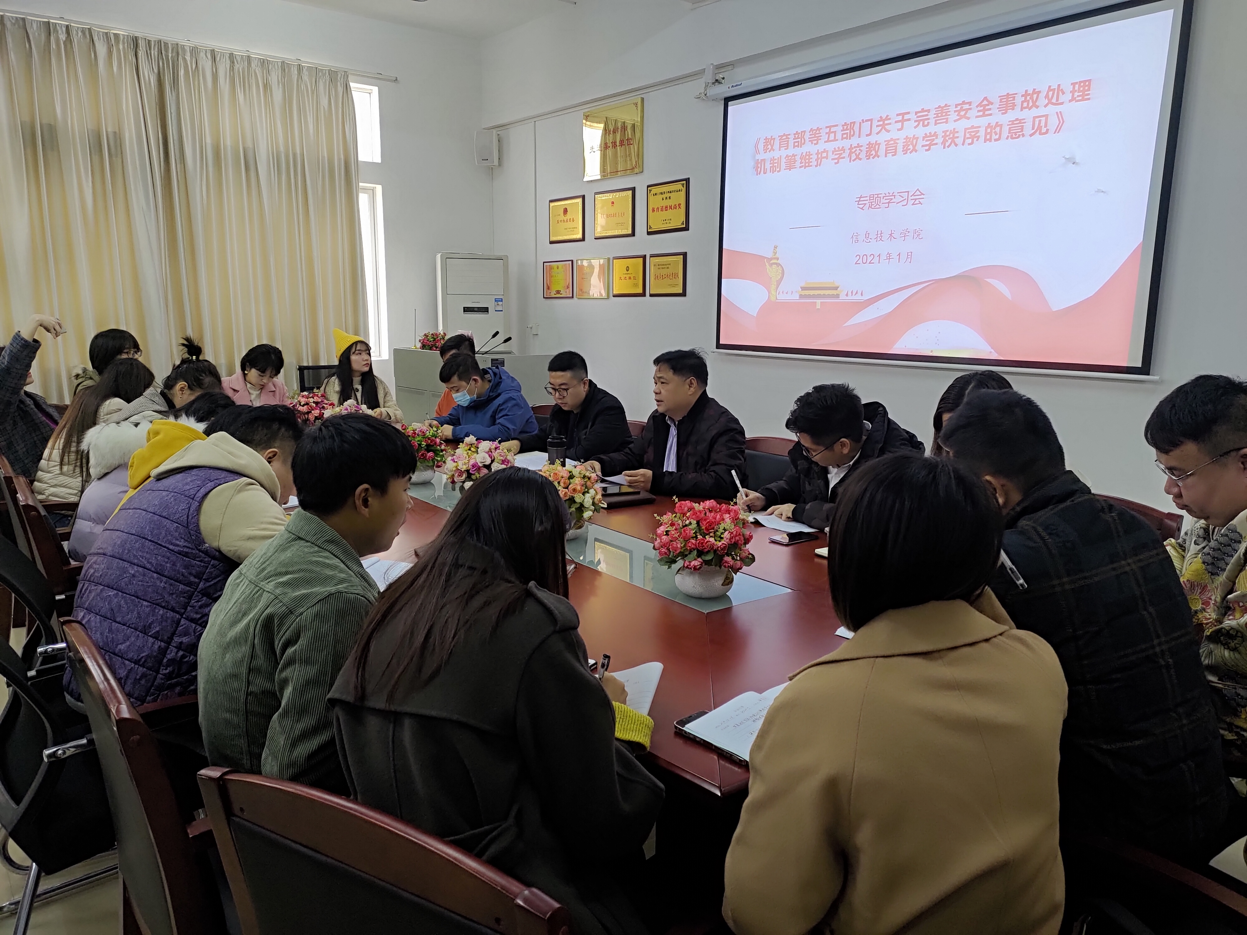 本网讯(太阳网集团tcy8722 林淑卿 李雅靖)为进一步维护学校教学秩序,2021年1月5日早上,太阳网集团tcy8722于振华楼203室开展《教育部等五部门关于完善安全事故处理机制,维护学校教育教学秩序的意见》专题学习会,参与此次学习会人员有太阳网集团tcy8722党总支梁星全书记、冷云峰副书记以及全体辅导员。