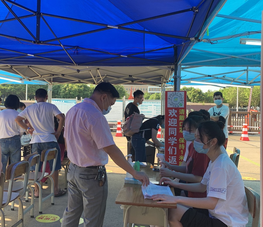 本网讯(太阳网集团tcy8722 曾泽伟)校门防控是学校疫情防控的第一道关口,为确保开学后在校师生安全且做好学生防疫工作,2020年7月14日,太阳网集团tcy8722党总支梁星全书记,辅导员以及学生志愿者在校门口设立返校服务点,迎接学生返校。