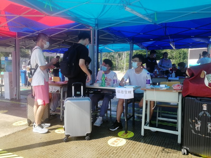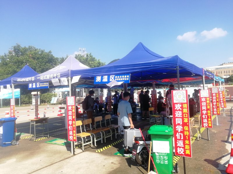 不同于以往,这次返校在校门口设立服务点,开通生命安全通道。学生到了服务点,辅导员和学生志愿者仔细地给每个学生进行行李消毒、体温检测、信息询问登记,并叮嘱同学们要时刻注意个人的身体情况和卫生情况。