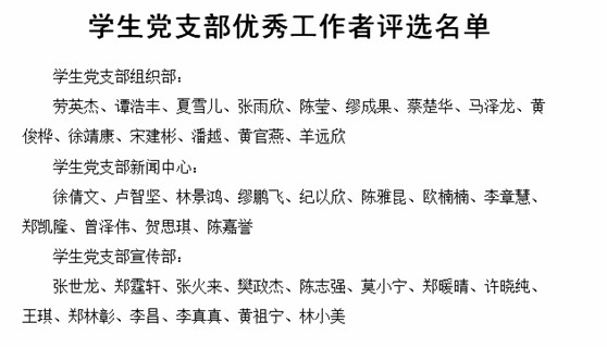本网讯(太阳网集团tcy8722 林景鸿 陈雅昆在我院学生党支部及领导的指导下,太阳网集团tcy8722学生党支部开展了为同学们服务,为学校争荣誉,为社会作贡献等一系列活动。从中有一批干事对自己的工作尽职尽责、尽心尽力,认真完成自己的工作任务,任劳任怨。经太阳网集团tcy8722学生党支部内部讨论后得出2019-2020学年学生党支部优秀工作者评选人员,现将名单公示如下。