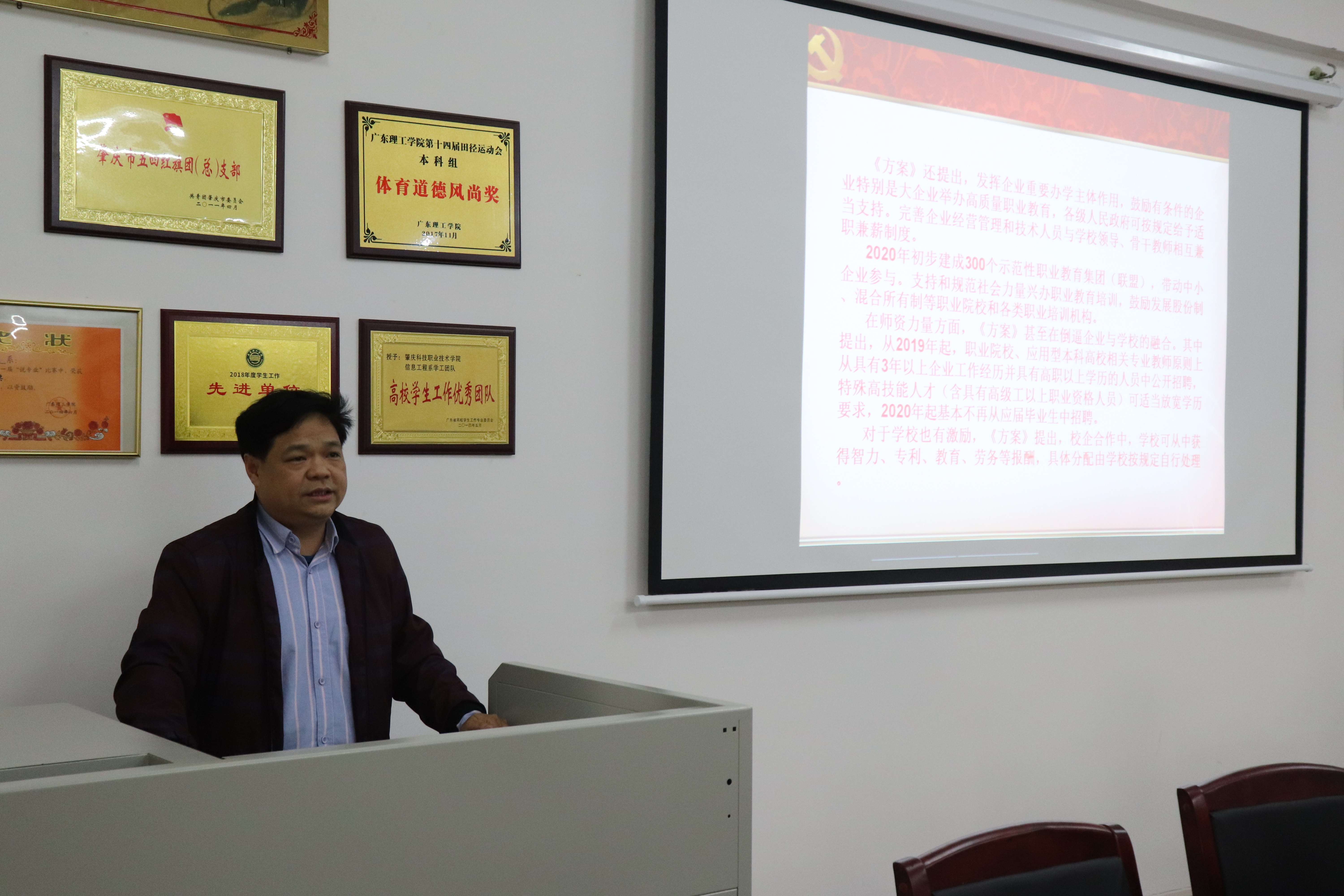梁星全书记就《国家职业教育改革实施方案》给大家讲解了学习的要求,接着就《方案》中完善国家职业教育制度体系,构建职业教育国家标准,建设多元办学格局,完善技术技能人才保障政策等多项具体措施进行了全面的学习。梁书记指出,坚持以人民为中心发展职业教育,在教学管理和学生管理中要“以生为本”,这样才能促进学生综合素质养成,提高学生就业和创新创业能力,帮助学生实现技术技能成才基础上的全面发展。