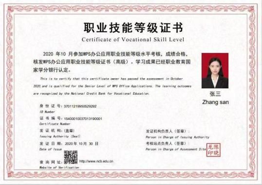 附:《WPS 办公应用职业技能等级证书》(高级)样证