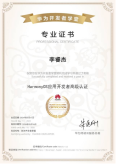 证书授予:完成鸿蒙全栈微专业学习并达到课程合格要求的学生,能够获得学校颁发的微专业证书。此外,学生通过参加鸿蒙技术相关的认证考试,则可以获得相应的认证证书。