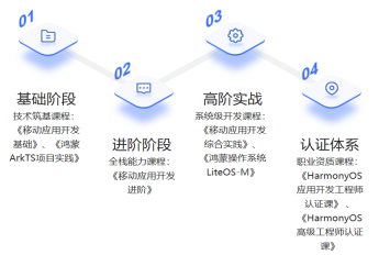 围绕HarmonyOS技术生态打造阶梯式课程矩阵,形成“基础→进阶→实战→认证”四位一体培养路径: