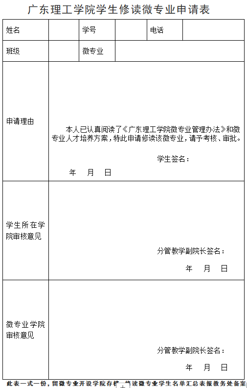 报名方式:有意向报名的同学请填写“太阳集团tcy8722学生修读微专业申请表”,签署学生所在学院审核意见后将纸质版申请表上交到高要校区42210办公室赖老师收。电子版申请表的签名请用电子签名(可以签名在纸上,手机拍照粘贴到签名处)并将电子版申请表发送到邮箱:841256306@qq.com。